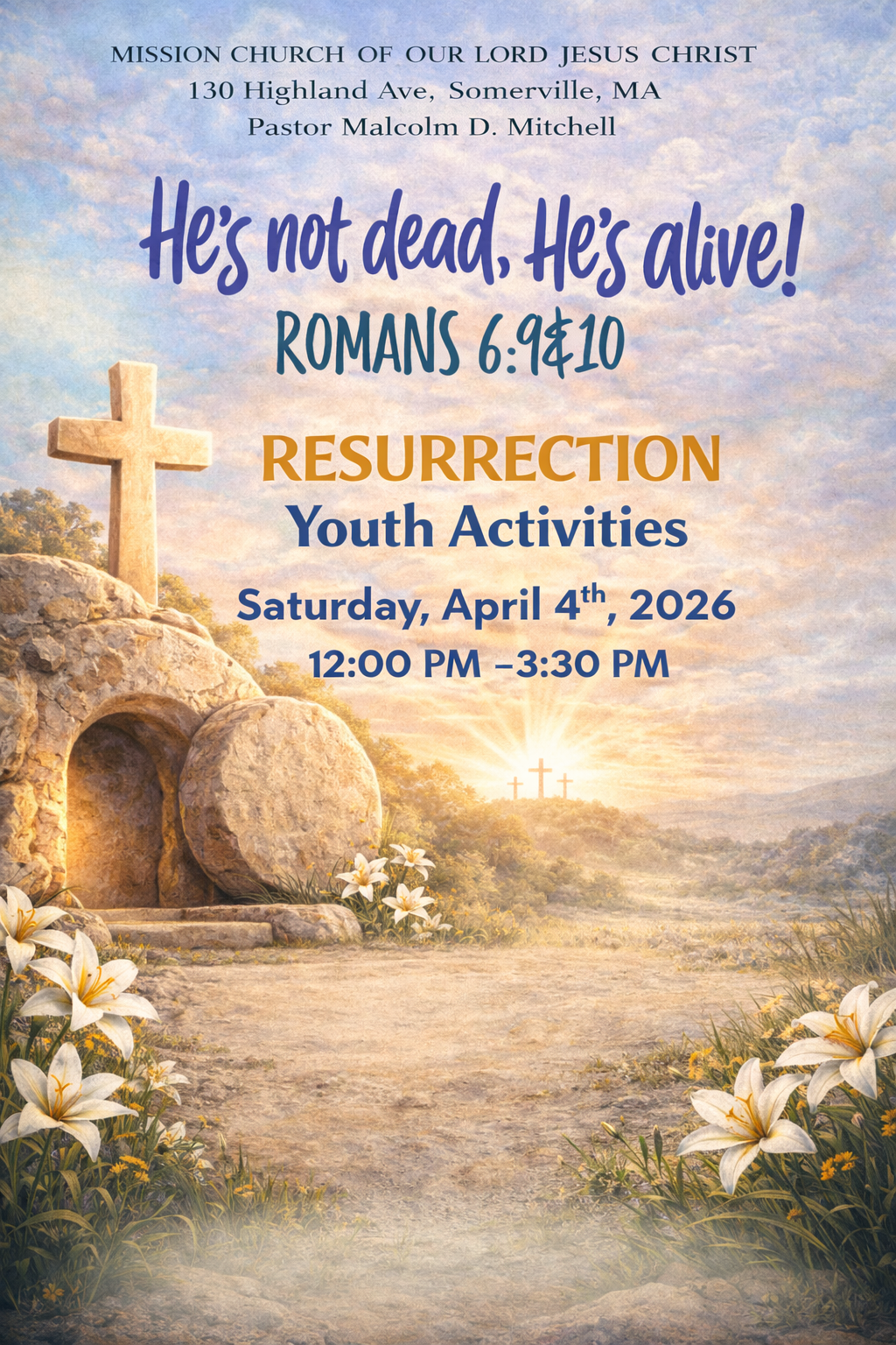 This special gathering is designed to bring our youth together for a meaningful time of fun, fellowship, and spiritual growth as we reflect on the resurrection of Jesus Christ. Through engaging activities, encouragement, and connection, we aim to strengthen the faith of our young people and remind them that He is not dead—He is alive!
